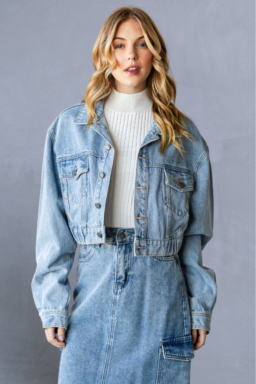 Drop Shoulder Puff Sleeve Denim Cropped Jacket