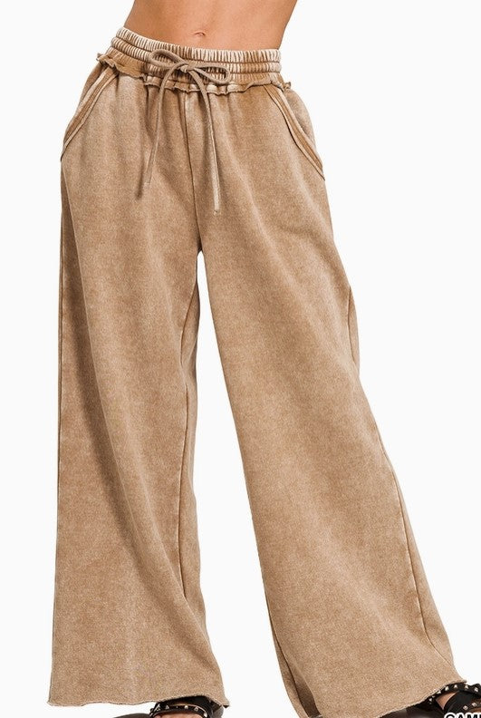 Acid Wash Fleece Palazzo Sweatpants with Pockets