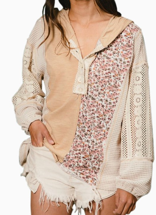 Slub Jersey With Lace Combo Buttoned Hoodie Top