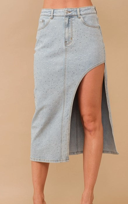 Asymmetrical Cut Out Studded Mid Rise Denim Skirt