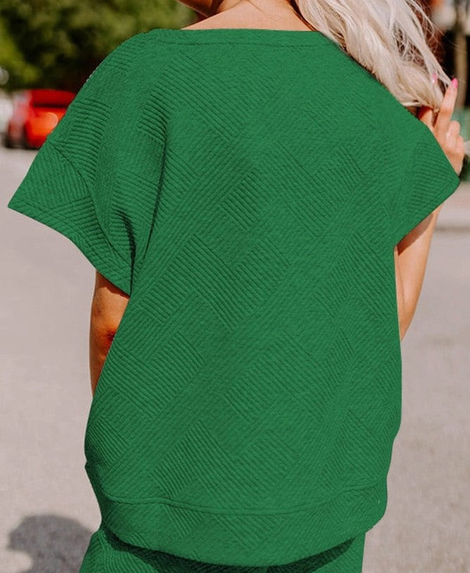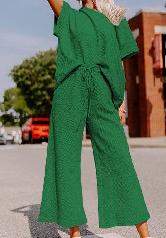 This lightweight knit lounge set includes a boxy short sleeve t-shirt and wide leg cropped pants with a relaxed fit. Benefitting from a drawstring waist for adjustable comfort, the pants also feature functional pockets for small items. The geometric textured fabric adds a fashionable touch, ideal for a casual and stylish look. Relax and stay cozy at home or step out in chic style for running errands around town.